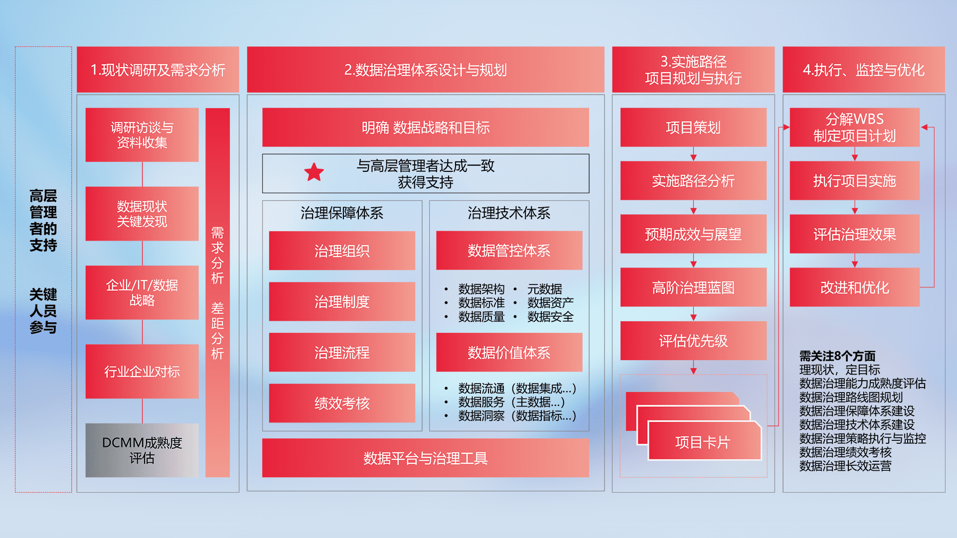 制定并执行统一的数据标准,,,规范数据定义和格式,,,消除冗余和不一致性,,,实现跨部门和跨系统的数据一致性,,,,为企业提供标准化的数据基础。。